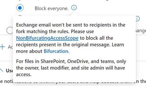 If you are configuring a DLP rule for emails, the above configuration can be misleading depending on how you interpret it. You might expect that selecting the "Block everyone" option would block the email thread for all recipients included in the original email. However, this is not the case. The email will only be blocked for those recipients on the email thread for whom the defined conditions match. To understand the details, hover over the information icon located near the setting.