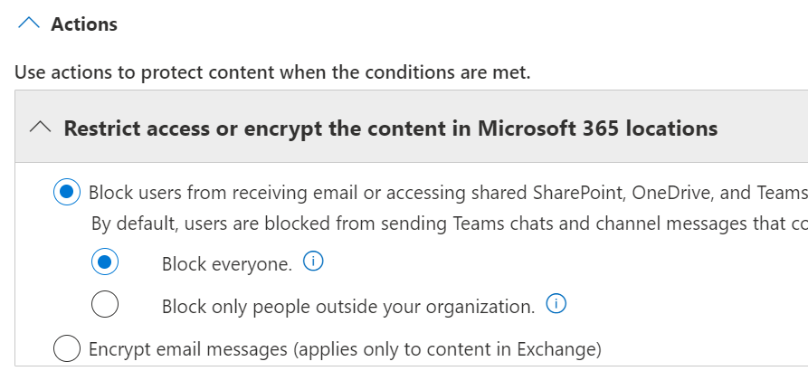 One of the action that I have regularly used within deployments is the "Restrict access or encrypt the content in Microsoft 365 location" and the configuration looks like this: